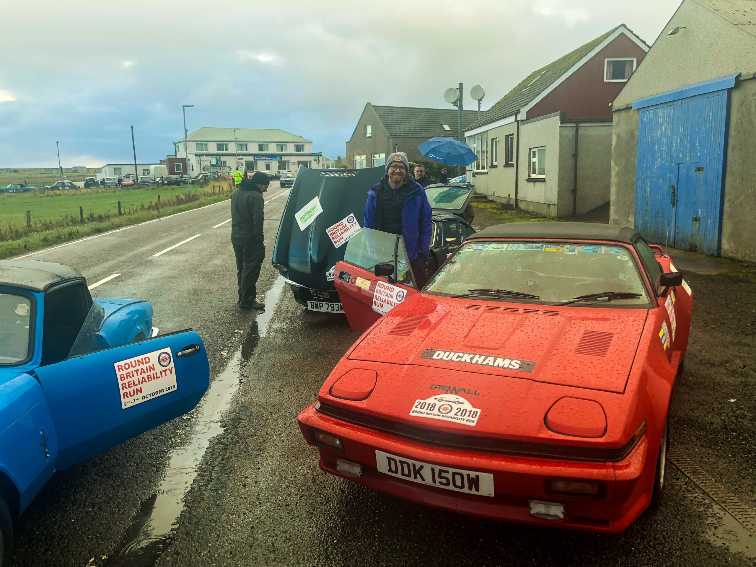 The Duckhams team’s Triumph TR made good pace up the A1, to the first control at Wetherby Services. Onwards then up the A68 to Carter Bar control on the Scottish border through some heavy rainstorms at times. Skirting around Edinburgh the next stop was Knockhill race circuit for a passage control before pressing on up the A9 to Skiach services just north of Inverness before making John O Groats for dawn. Here there was a chance for teams to refresh with a cooked breakfast before making their way along the North Coast of Scotland and on into the Highlands to return to Skiach to check in before heading inland to Fort William and then the control at Stirling via Glen Coe where half of the 2000 miles is then covered. It was just after Thurso however, when drama struck for the Duckhams team: